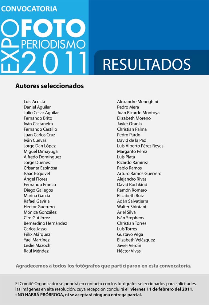 El Comité Organizador de la Expofotoperiodismo 2011 está integrado por los fotógrafos: Alfredo Estrella, Claudia Guadarrama, Cristina Rodríguez y Eduardo Verdugo.