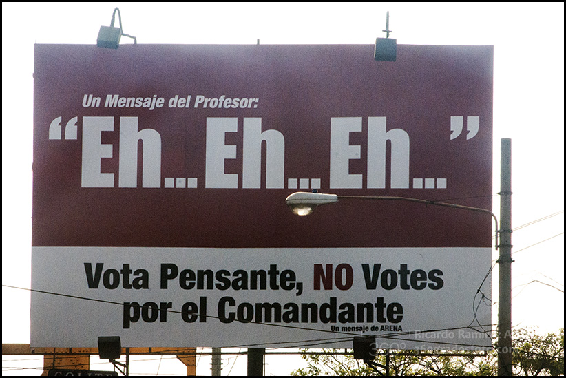 Por parte de la derecha, hoy coyunturalmente reagrupada alrededor de ARENA, la constante del discurso pareciera aprendido de los viejos manuales de guerra psicológica editados y puestos en práctica durante la Guerra Fría en todos lados: Guatemala, República Dominicana, Chile, Nicaragua… Más allá de las propuestas, la campaña hacia los sectores indecisos ha estado marcada por una apuesta al miedo y al terror, que va desde reseñas de Nuestra Señora de Fátima y plegarias a Dios y a la Virgen María contra Cuba, Venezuela y el Socialismo del Siglo XXI; a la impregnación hasta el cansancio del acontecer venezolano televisado desde Estados Unidos, que convierte a “Venezuela” en nombre, sinónimo y adjetivo reiterado en toda discusión política salvadoreña; hasta el retumbar de la “Marcha de ARENA” en todos los Puestos de Orientación instalados a las afueras de los centros de votación el pasado 9 de marzo que dice: “Cuando en la amada patria / extrañas voces se oyeron, / los nacionalistas surgieron diciendo así: / Patria SI / Comunismo NO / Patria SI / Comunismo NO / Libertad se escribe con sangre, trabajo, con sudor. / Unamos sudor y sangre, pero primero El Salvador. / Unamos sudor y sangre, pero primero El Salvador. / El Salvador será la tumba donde los rojos terminarán, / salvándose aquí América / Nuestra América inmortal…”